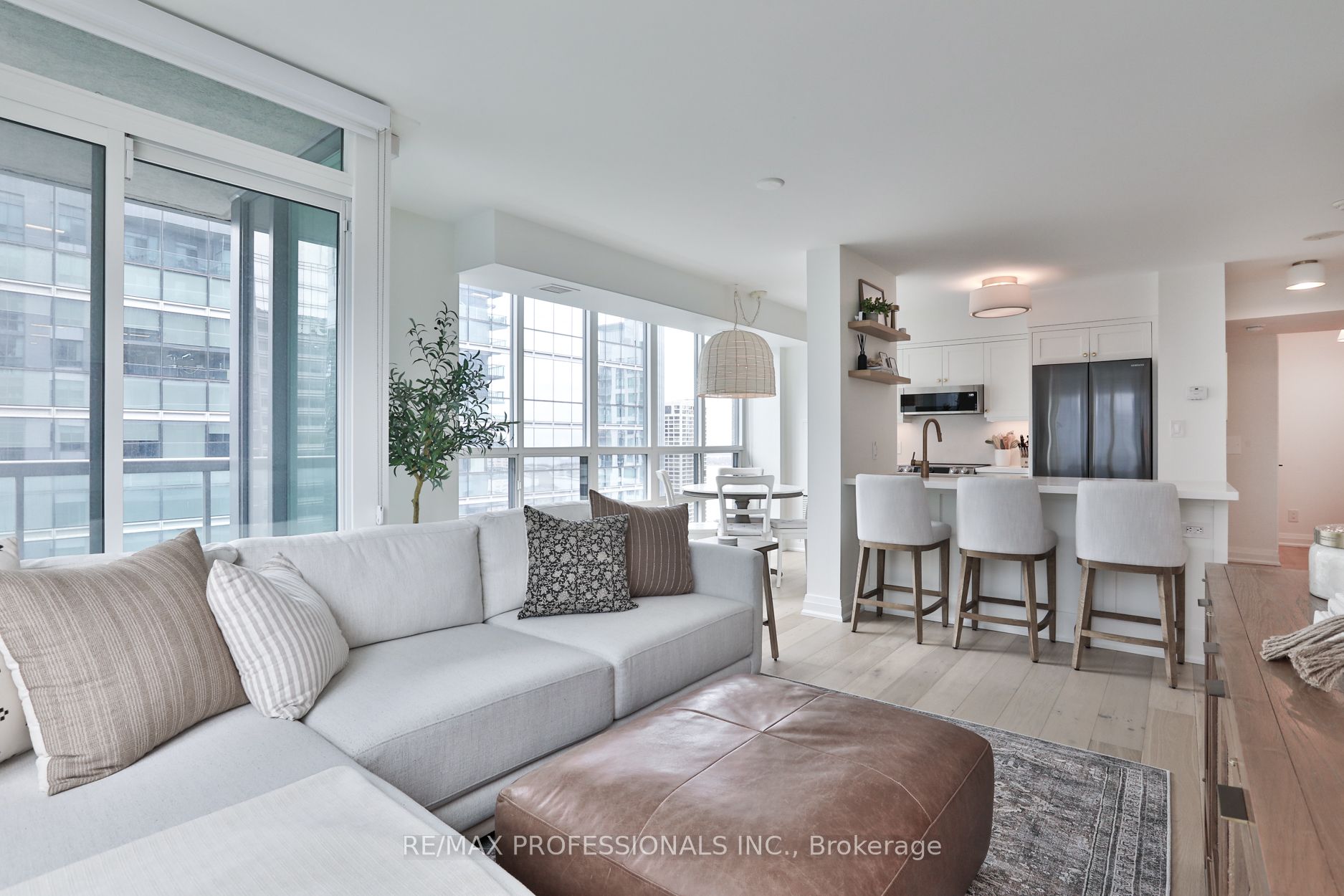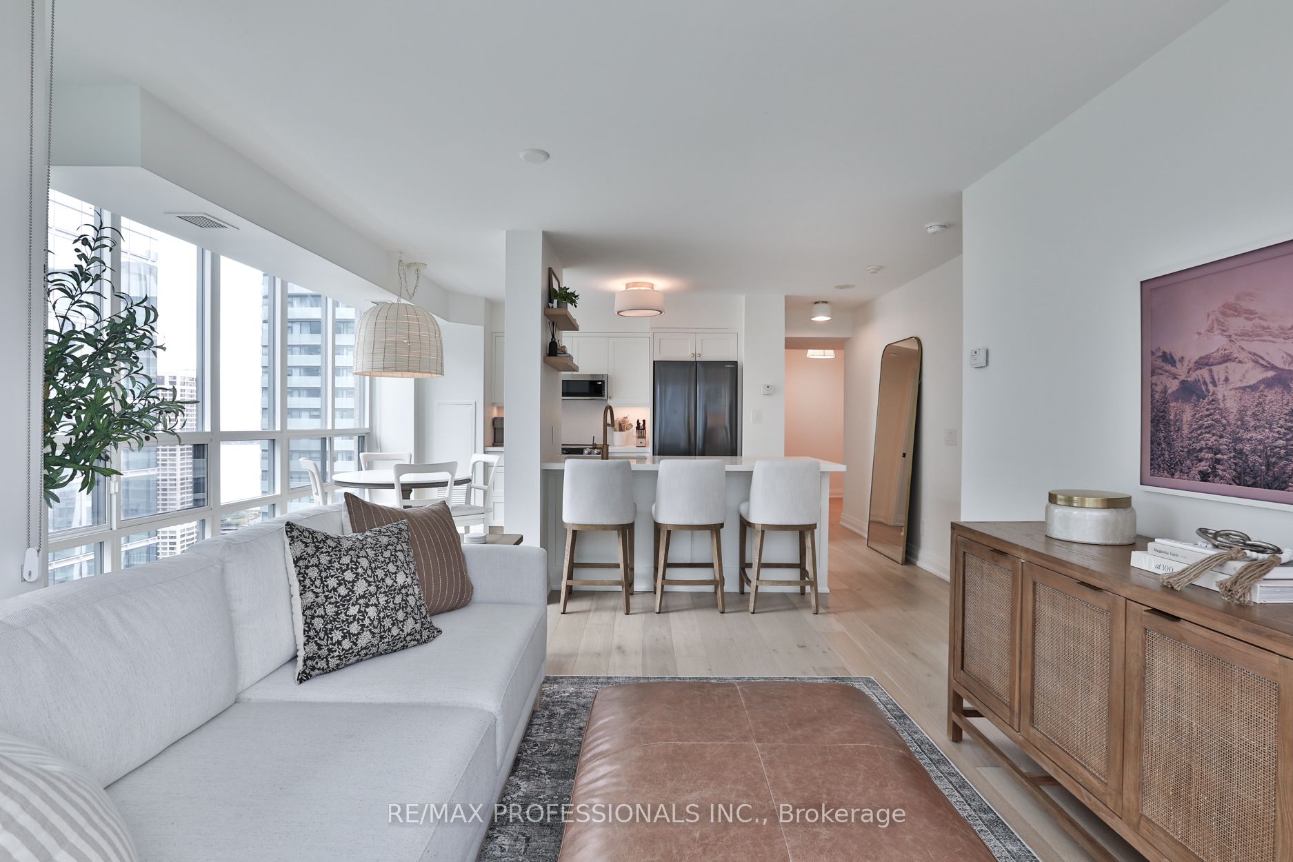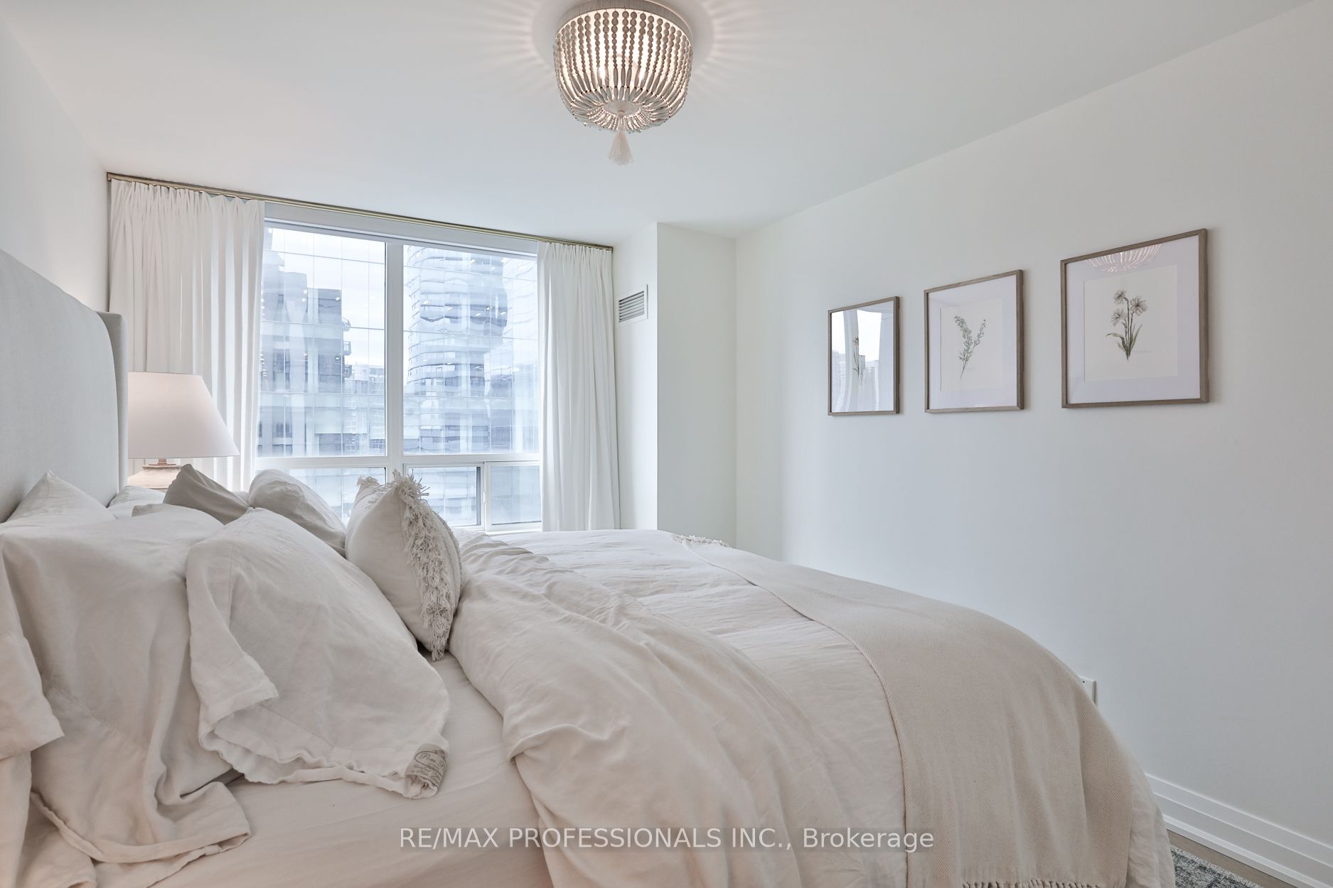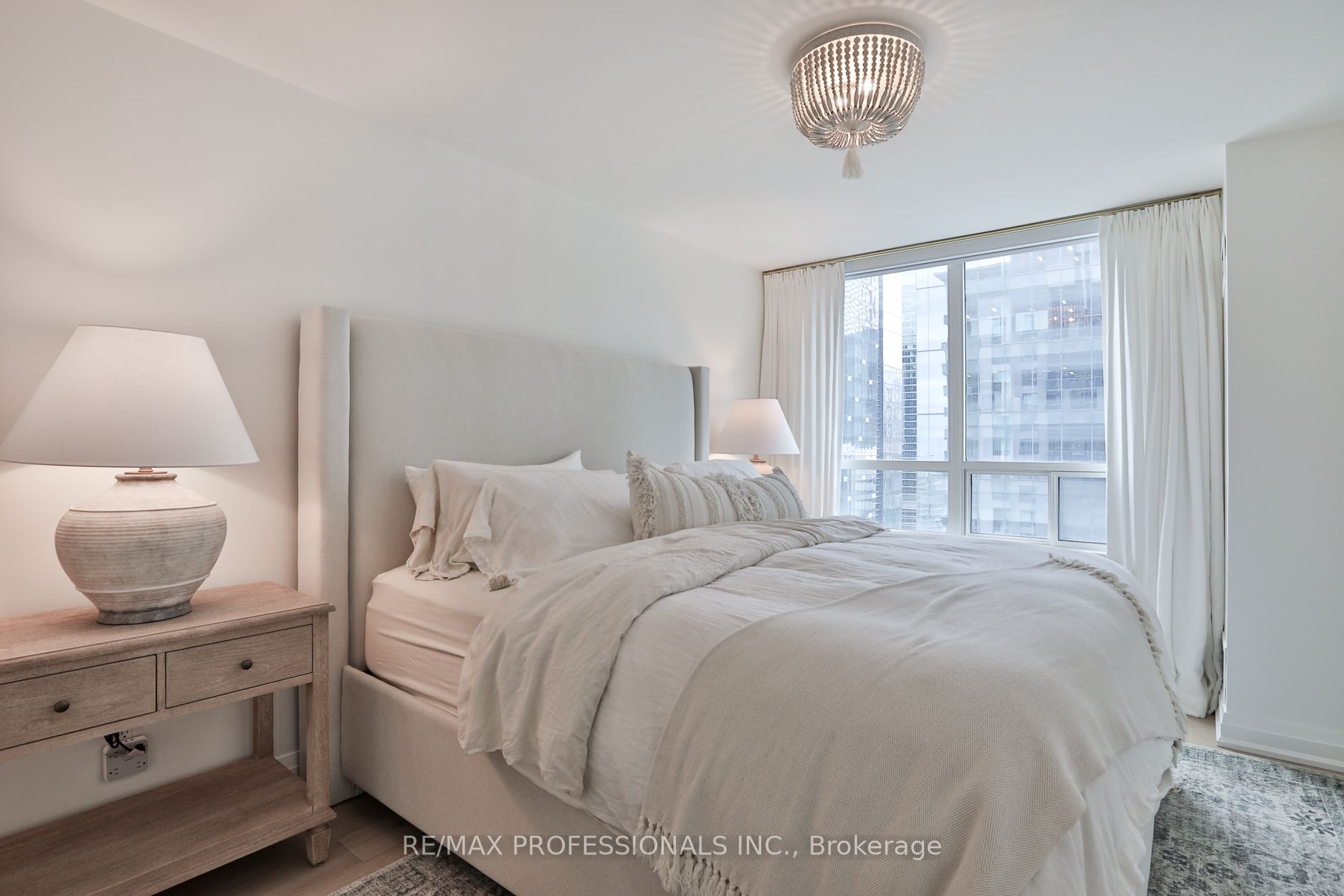Welcome to Infinity 1, an upscale residence nestled in the heart of a vibrant urban landscape! This exceptional location places you mere steps away from Union Station, Scotiabank Arena, Rogers Centre, the CN Tower, PATH Shopping, the Financial District, Waterfront/Harbourfront, an array of restaurants, grocery stores, and more. Presenting a stunning 885 square foot, 2-bedroom suite that has undergone a comprehensive renovation, showcasing sophisticated design elements and meticulous attention to detail. The bright and airy open-concept living space enjoys tons of natural light from floor-to-ceiling and wall-to-wall windows, and features gorgeous wide-plank flooring and custom roller blinds. Step onto the balcony to enjoy breathtaking city views! The gourmet kitchen, ideal for entertaining, is equipped with shaker cabinetry, top-of-the-line stainless steel appliances, and gleaming quartz countertops complete with a breakfast bar. Retreat to the tranquil primary bedroom including a double custom closet and a lux 4-piece ensuite bathroom featuring a deep soaker tub and designer finishes. The second bedroom, also boasting a double custom closet, and an additional 3-piece bathroom round out the floorplan. Twin double closets in the entry provide for ample storage. Don’t miss the opportunity to experience this fully turnkey unit firsthand! **All-inclusive maintenance fee = no additional utility bills! **